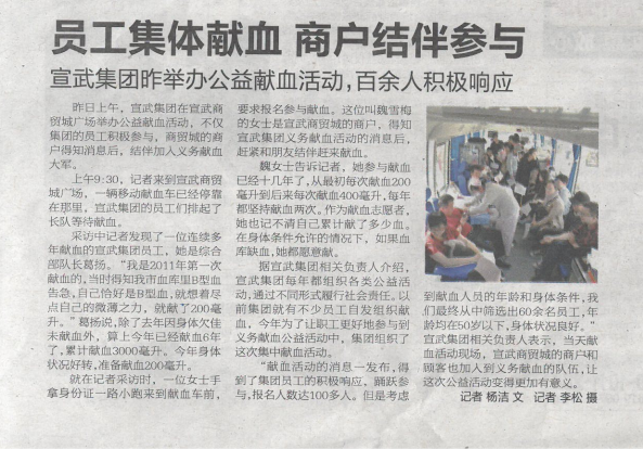 2017年4月22日,《都市晨報(bào)》對(duì)宣武集團(tuán)職工無(wú)償獻(xiàn)血活動(dòng)進(jìn)行報(bào)道,彰顯了宣武社會(huì)正能量。